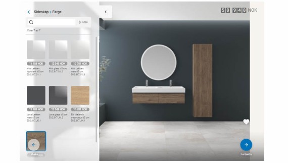 Design badet ditt ved å endre baderomsprodukter og farger på veggen. Bli inspirert ved å variere produktfargene og se hvilken forskjell det gjør å ha et rundt speil i stedet for et firkantet. Og hva skjer hvis du velger en mørkere farge enn du først hadde tenkt til veggene?